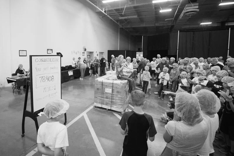 Volunteers from the community are invited to come fill 7 shifts over 3 days to pack 400,000 meals for countries who are in the most need of this lifesaving food.